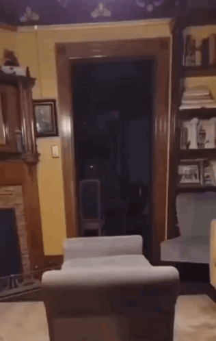 A ghostly figure, possibly a dog, quickly moves through a dark living room, creating a scary atmosphere.