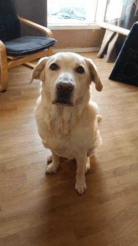 Happy dog Teegan, a yellow Labrador Retriever, sitting on a wooden floor and smiling brightly at the camera.
