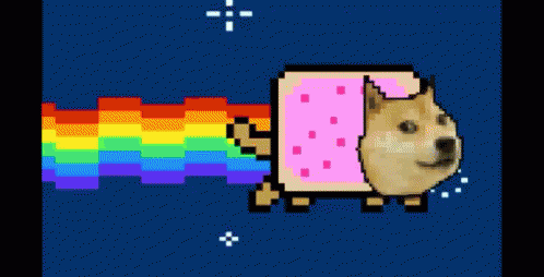 Pixelated Doge meme flying through space with a rainbow trail, reminiscent of Nyan Cat.