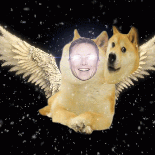 A Doge meme dog with angel wings features Elon Musk's face, floating in a snowy, starry background.