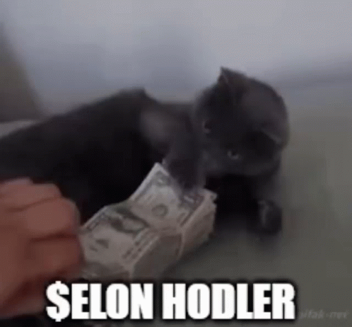 A cat fiercely guards a stack of money with the text '$ELON HODLER', referencing Dogelon Mars cryptocurrency.