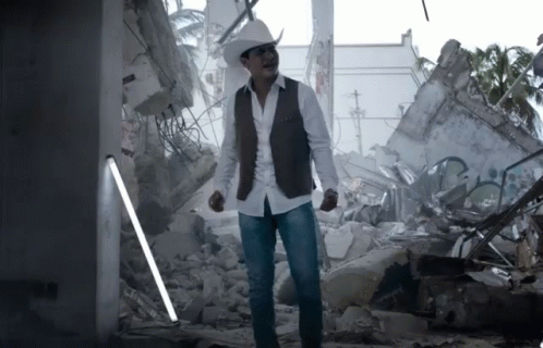 Ulices Chaidez sings emotionally in a cowboy hat amidst rubble, expressing heartbreak and pain.