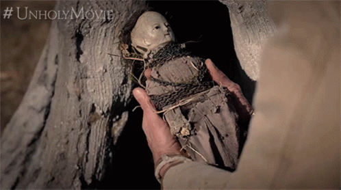 A person discovers a creepy, ceramic doll, wrapped in cloth and string, hidden within a tree hollow.