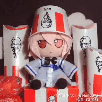 A Touhou Project plushie, associated with Dom Corleo, wears a KFC bucket hat and eats fried chicken.