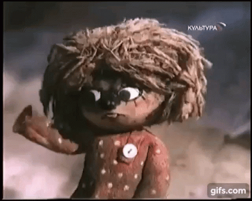 Domovenok Kuzya, the stop-motion animated character, scratches his shaggy head.