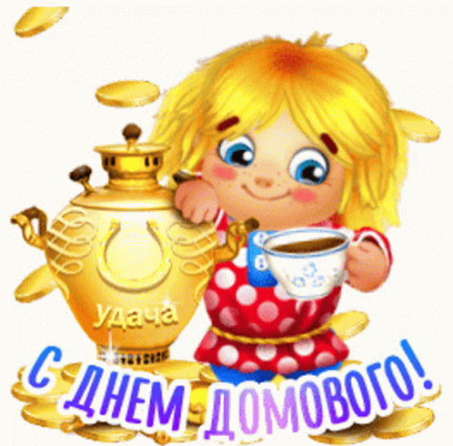 A cartoon girl with a samovar celebrates Domovoy Day, wishing luck and protection for the home and attracting wealth.