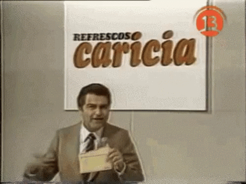 Don Francisco hosts Sabados Gigantes, holding a card in front of a 'Refrescos Caricia' sign.