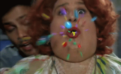 Dona Redonda from Saramandaia experiences a colorful explosion of candy from her mouth, surprising onlookers.