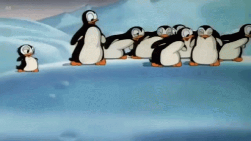 Donald Duck leads a group of penguins in a march across an icy landscape.