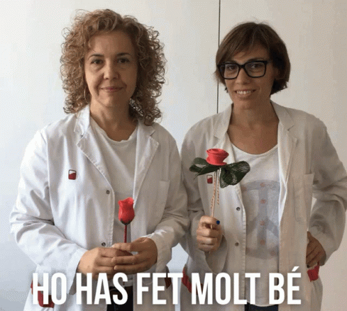 Two women in white coats present roses and give a thumbs-up, saying 'You have done very well.'