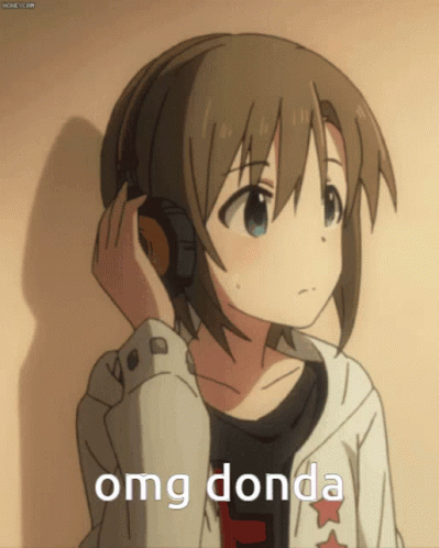 Anime girl reacts to 'omg donda' while listening to music with headphones.