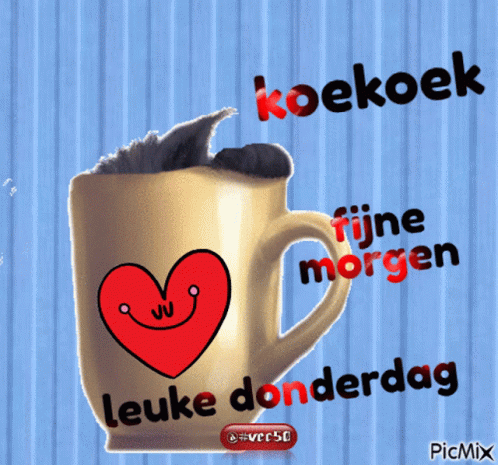 An adorable animated black cat peeks from a mug with Dutch greetings 'Good Morning' and 'Happy Thursday'.