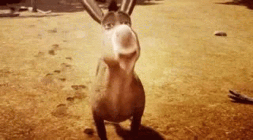 Shrek's Donkey stands on a dirt field, showing a wide, cheerful smile.