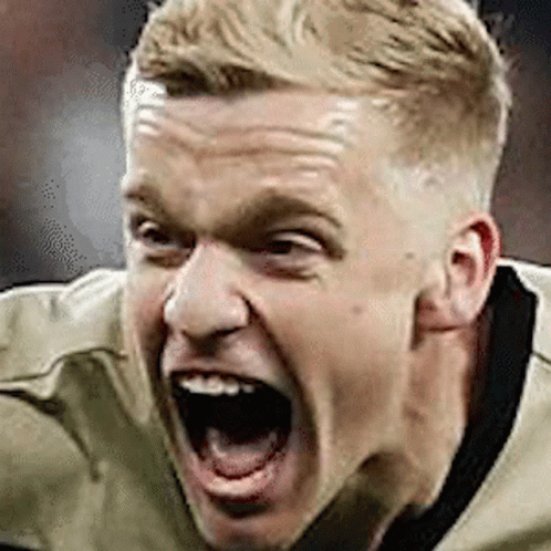 Donny van de Beek captured in a close-up, screaming with intense emotion, mouth wide open.