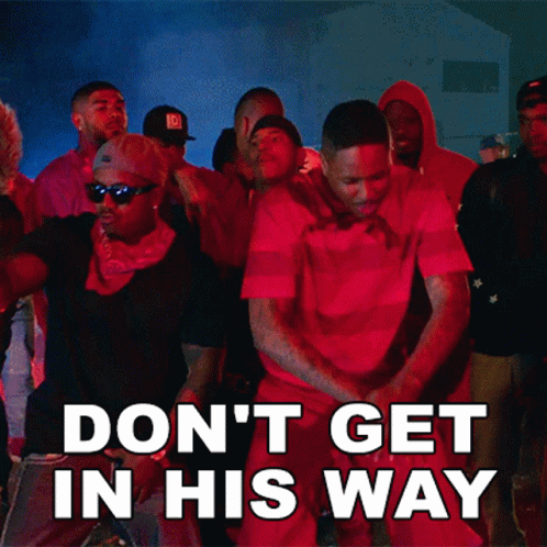 a group of men are dancing with the words " do n't get in his way " written above them