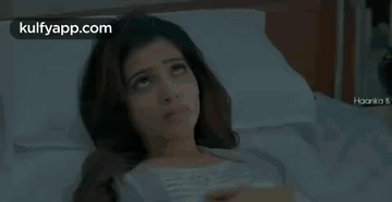 Samantha lies in bed, looking up and touching her face, appearing thoughtful or distressed.