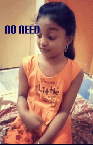 A young girl in an orange 'Mommy's Little Lady' shirt gestures 'no need' with a smile.