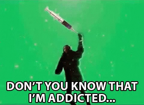 A man holds a large syringe overhead, with the text 'Don't You Know That I'm Addicted...' displayed.