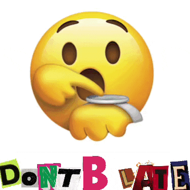 A yellow smiley emoji points to a watch, with 'Don't Be Late' text below, urging punctuality.
