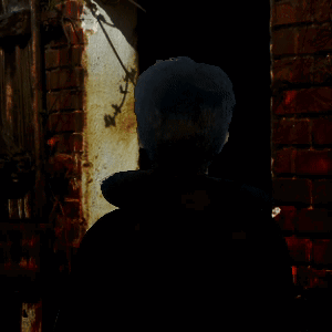A person approaches a dark doorway, leading to a sudden close-up of a scary face with glasses.