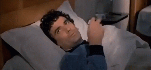 Italian actor Massimo Troisi lies in bed, holding a thermometer, with the caption 'LATER' appearing.