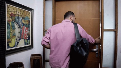Man in pink shirt accidentally slams his finger in a door, reacting with a pained expression.
