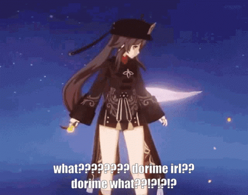 Hu Tao from Genshin Impact performs an action, accompanied by the popular 'Dorime' meme text overlay.