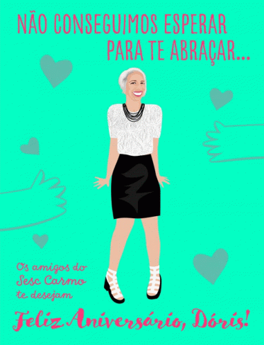 A vibrant birthday greeting for Dóris from Sesc Carmo friends, featuring a smiling woman and a warm hug.