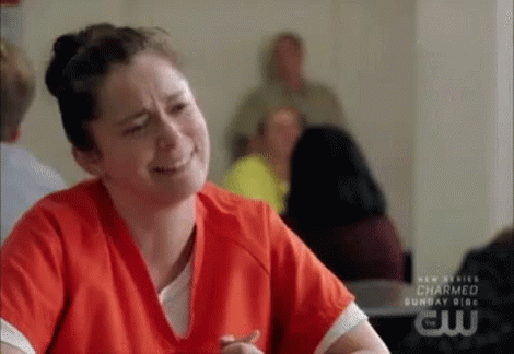 Rebecca Bunch, wearing an orange uniform, says she's not that much of a dork, transitioning from crying to a smile.
