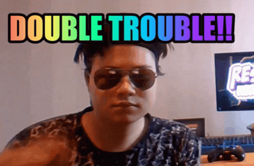 A person wearing sunglasses gets a 'double trouble' surprise with two fidget spinners placed on their head.