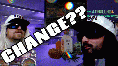 Dougit Dougs and another man question 'CHANGE??' in a meme-style video with floating heads and crypto themes.