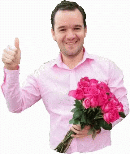Dr. Javier Rosas, wearing a pink shirt, holds a bouquet of pink roses and gives a thumbs up.