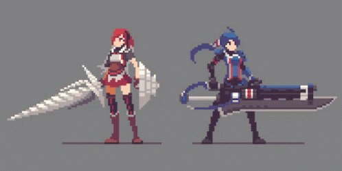 Two detailed pixel art characters, Dra with a drill sword and Windy with a large gun, against a gray background.