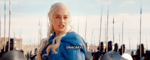 Daenerys Targaryen, in a blue cape, commands 'Dracarys' before her army of Unsullied.
