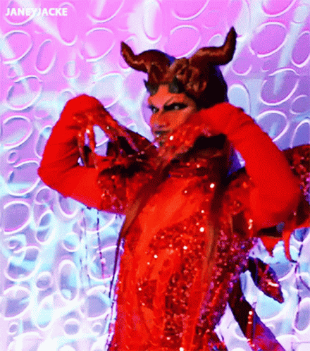 Yuri Guaii showcases her fierce devil costume with horns and fangs on Drag Race Down Under, striking a pose.