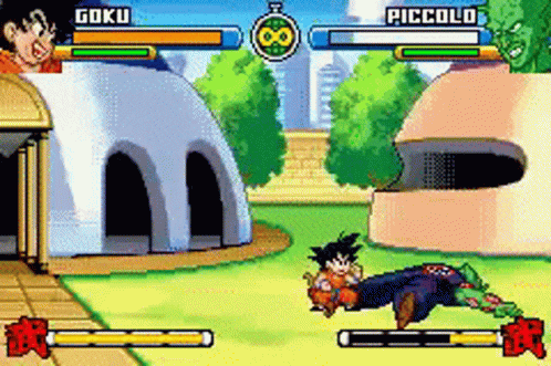 Goku and Piccolo battle in a pixelated fight from Dragon Ball Advanced Adventure on Game Boy Advance.