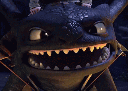 Toothless, the Night Fury dragon from How To Train Your Dragon, smiles widely while being ridden.