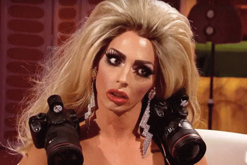 Alyssa Edwards from Drag Race looking shook while holding two cameras.