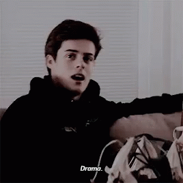 Chris from Skam reacts to drama with an expressive open-mouthed look while sitting on a couch.