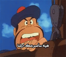 A character from the anime Adnan Lina (Future Boy Conan) yells angrily, with Arabic text 'I will knock you down to the ground'.