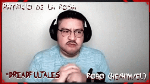 Patricio de la Rosa from Dreadful Tales with hands up gesture, wearing headphones and glasses.