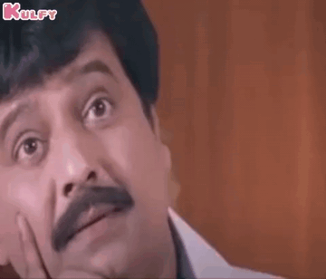Actor Vivek as Palakkattu Madhavan, deep in thought with a hand on his chin, pondering a dilemma.
