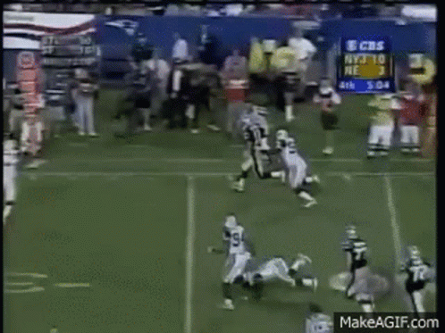 Drew Bledsoe of the New England Patriots tackled by Mo Lewis of the New York Jets during a football game.