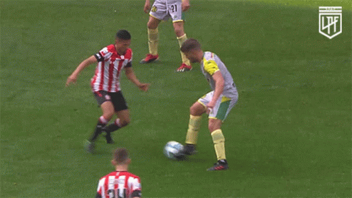 A soccer player executes a skillful dribble, nutmegging an opponent during a Liga Profesional de Fútbol match.
