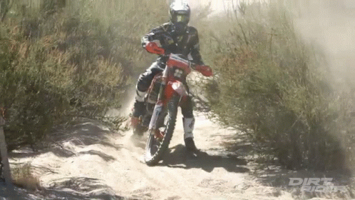 A dirt bike rider skillfully drifts through a dusty, off-road trail, kicking up a cloud of dirt.