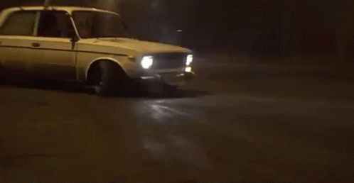 Car drifting at night, creating smoke on a dark street with streetlights in the background.