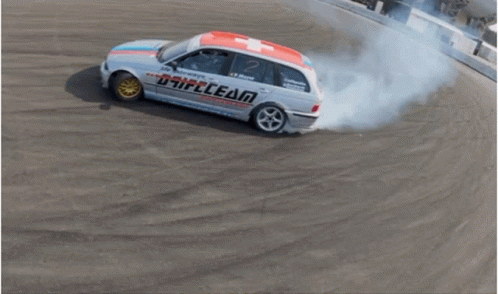Driftteam Switzerland's BMW wagon, driven by Jan Behrendt and Patrick Mayer, performs a powerful, smoky drift.