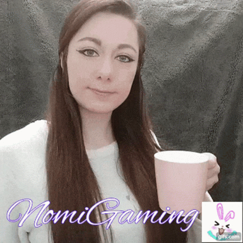 Nomi Gaming sips from a pink mug, enjoying a warm drink like hot chocolate.