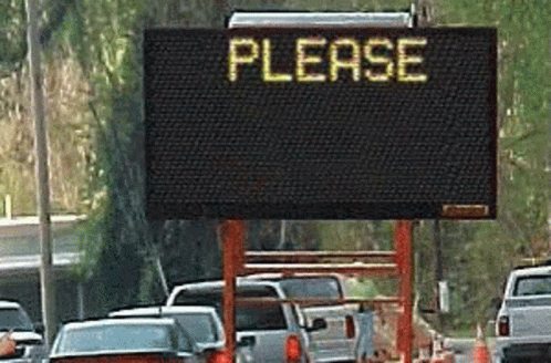 A digital road sign displays 'PLEASE DRIVE SAFE' on the side of a highway, visible above cars in traffic.