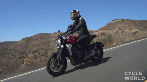A person rides a red Honda CB1000R motorcycle downhill on a scenic road, featured by Cycle World.